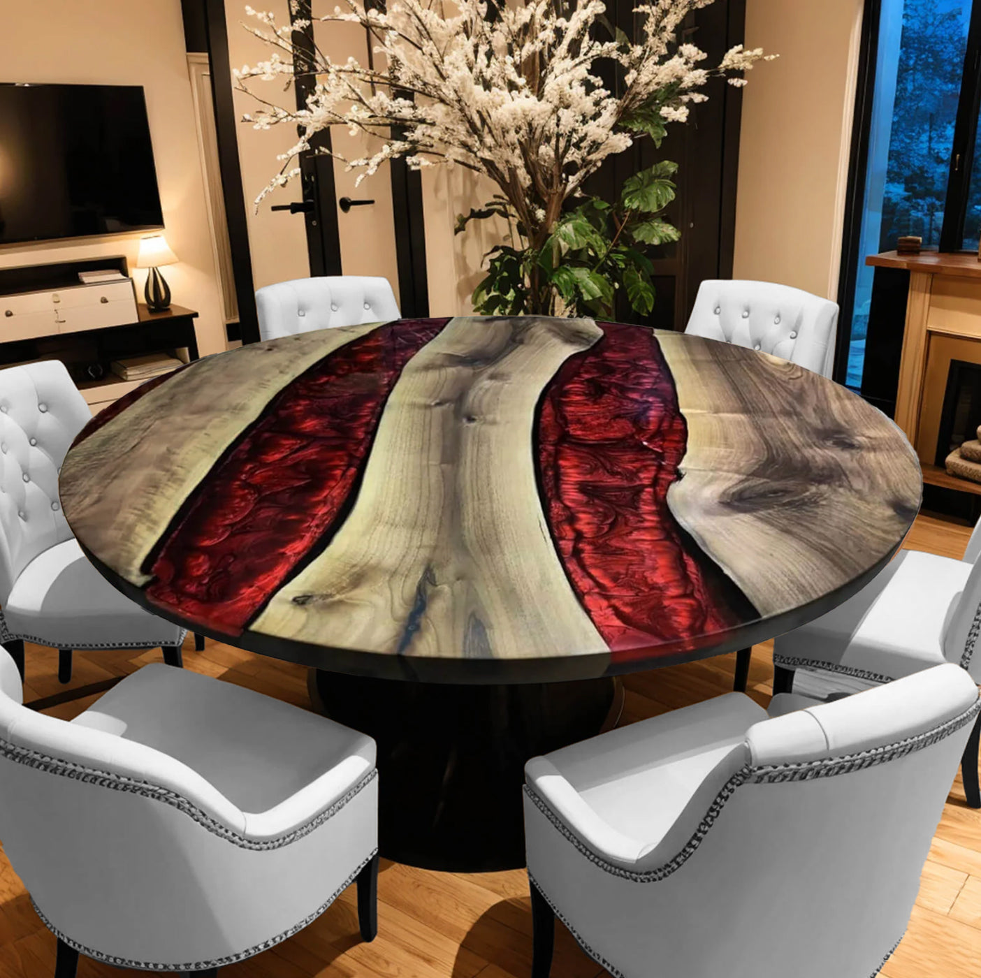Introduce a vibrant pop of color to your living room with the Custom Black Walnut Epoxy Resin Round Coffee Table featuring bold Red Resin. The rich, dark tones of the black walnut wood beautifully contrast with the striking, fiery red resin, creating an eye-catching and contemporary centerpiece.